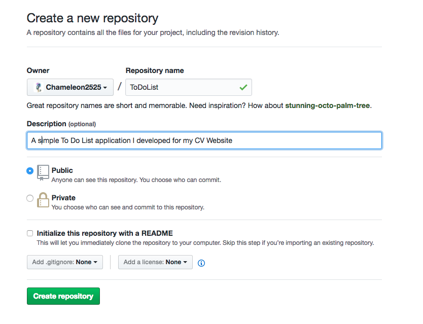 Start by creating a new repository at github.com/new. Give it a name, optionally add a description, and decide whether to make it public or private.